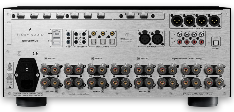Basierend auf der preisgekrönten ISP Elite MK3- Plattform ist der immersive Mehrkanal Verstärker StormAudio Fusion 20 ein 20-Kanal-Prozessor, der 16 Endstufen der neuesten Edge-Verstärkungstechnologie des dänischen Unternehmens ICE Power integriert hat. Der Fusion20 leistet last-stabile 150 Watt (an 8 Ohm) mit extrem niedrigem Rausch- und Verzerrungswerten. Im gebrückten Betrieb sind max 500 Watt (an 8 Ohm) möglich, womit auch passive Subwoofer angetrieben werden können.